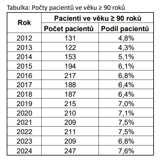 V období od 1.1.2012 do 31.12.2024 bylo v naší ambulanci provedeno 38741 kontrol kardiostimulátorů. Průměrný věk nemocných byl 76,1 ± 11.1 roků (40,0 % žen). Počet pacientů ve věkové skupině ≥ 90 roků a jejich podíl na celkovém počtu nemocných je značný, jejich absolutní počet i relativní podíl navíc neustále narůstá (tabulka), což odráží stárnutí populace a zvyšující se potřebu kardiostimulační péče u seniorů. Tento trend klade zvýšené nároky na zdravotnický personál a zdůrazňuje potřebu optimalizace péče a zdrojů pro tuto specifickou skupinu pacientů. Bude si to žádat větší zaměření na vzdělávání sesterského personálu v oblasti geriatrie, psychologie stáří a na komunikační dovednosti s touto věkově ohraničenou skupinou pacientů. Studie přispívá k lepšímu pochopení demografických změn a pomáhá při plánování budoucí zdravotní péče v oblasti kardiostimulace.