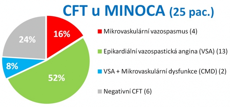 V rámci českého registru CFT vyšetření - CoroPhys-CZECH, bylo do října 2025 vyšetřeno 25 pacientů s MINOCA - 76 % žen, medián věku 59 let [22-75]. Mikrovaskulární dysfunkce byla detekovaná u 2 pacientů (8 %), pozitivní acetylcholinové testování u 19 (76 %) - výsledné endotypy zahrnovaly epikardiální vazospasmus (VSA) (52 %), mikrovaskulání vazospasmus (16 %), VSA + mikrovaskulární dysfunkce (8 %) a negativní CFT (24 %). V souboru jsme z potenciálních nežádoucích událostí pozorovali bradykardii při Ach testování u 5 pacientů (20 %) a asystolii ≥ 3 sekundy u 4 pacientů (16 %) oboje vždy tranzientní a asymptomatické, a paroxysmus fibrilace síní při Ach testování u 1 pacienta (4 %), který byl asymptomatický a promptně farmakologicky zvertován propafenonem; všechna vyšetření byla provedena radiálním přístupem.